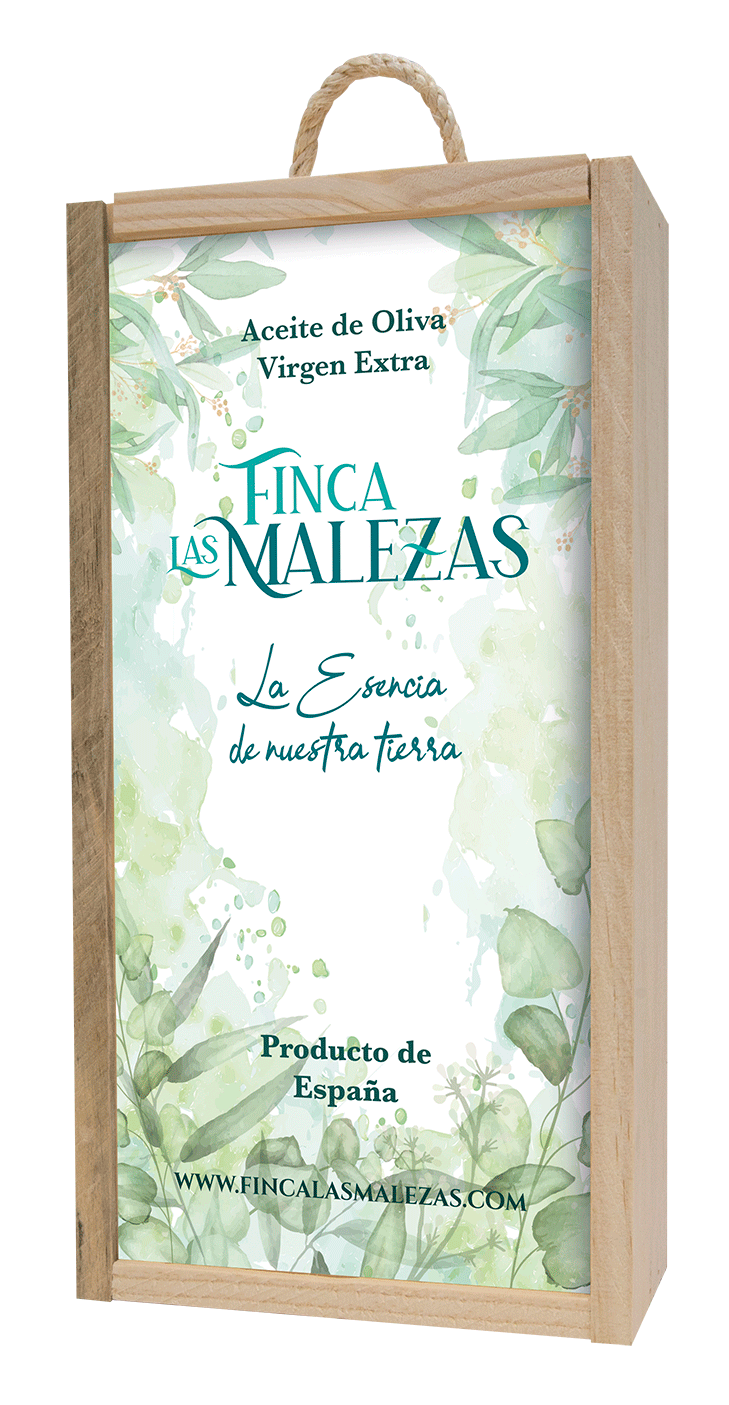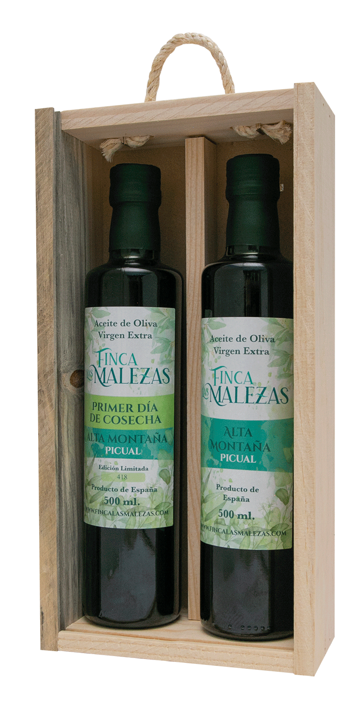 Disfrute de nuestro estuche de AOVES Finca Las Malezas con 2 botellas de 500 ml, una de Alta Montaña Primer Día de Cosecha Picual y otra de Alta Montaña Picual.