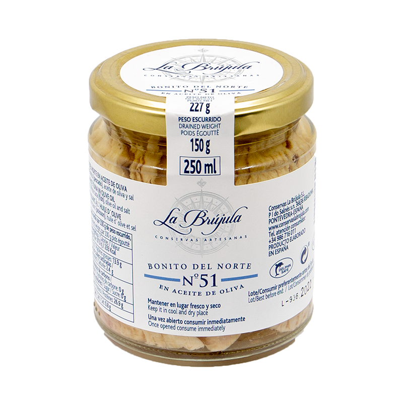 Bonito del Norte capturado en el Mar Cantábrico empleando artes de pesca tradicionales. Se limpia uno a uno conservando su textura y jugosidad.