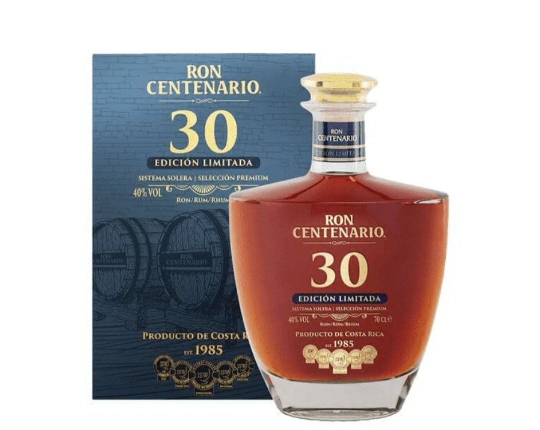 Ron Centenario 30 años es una excepcional y exclusiva mezcla de rones de edición limitada lograda gracias a un añejamiento artesanal bajo el método solera. Con gran cuerpo y bouquet, este ron se distingue entre los expertos por ser “amaderado” y frutal. Frutos rojos, almendras con vainilla, chocolate, tabaco, madera y ahumado. Cremoso y muy sedoso, larga permanencia en boca, afrutado y con notas a chocolate.