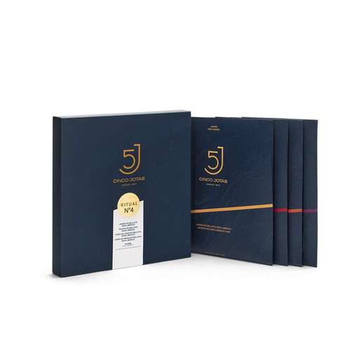 Un ritual de degustación de los mejores productos de Cinco Jotas. El sabor único del jamón, paleta, lomo y presa Cinco Jotas presentados en un cuidado pack regalo gourmet pensado para los paladares más selectos.