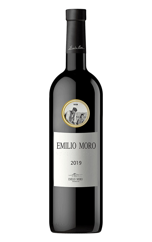 Este vino lleva el nombre del creador y alma mater de la casa. Desde 1998 se refiere al vino elaborado a partir de viñedos plantados con la variedad Tempranillo de entre 12 y 25 años. Esta añada 2019, de perfil más mediterráneo de lo habitual, se muestra muy compleja aromáticamente, con un perfecto equilibrio entre concentración y sutileza. Un tinto serio pero goloso, en el que se aprecian taninos amables que acarician el paladar. Las etiquetas de Emilio Moro destacan por su imagen de un medallón que cuenta la historia de la familia desde sus inicios. En Emilio Moro vemos una foto de Emilio Moro vendimiando con su padre en el viñedo de La Rendeja (1938).
